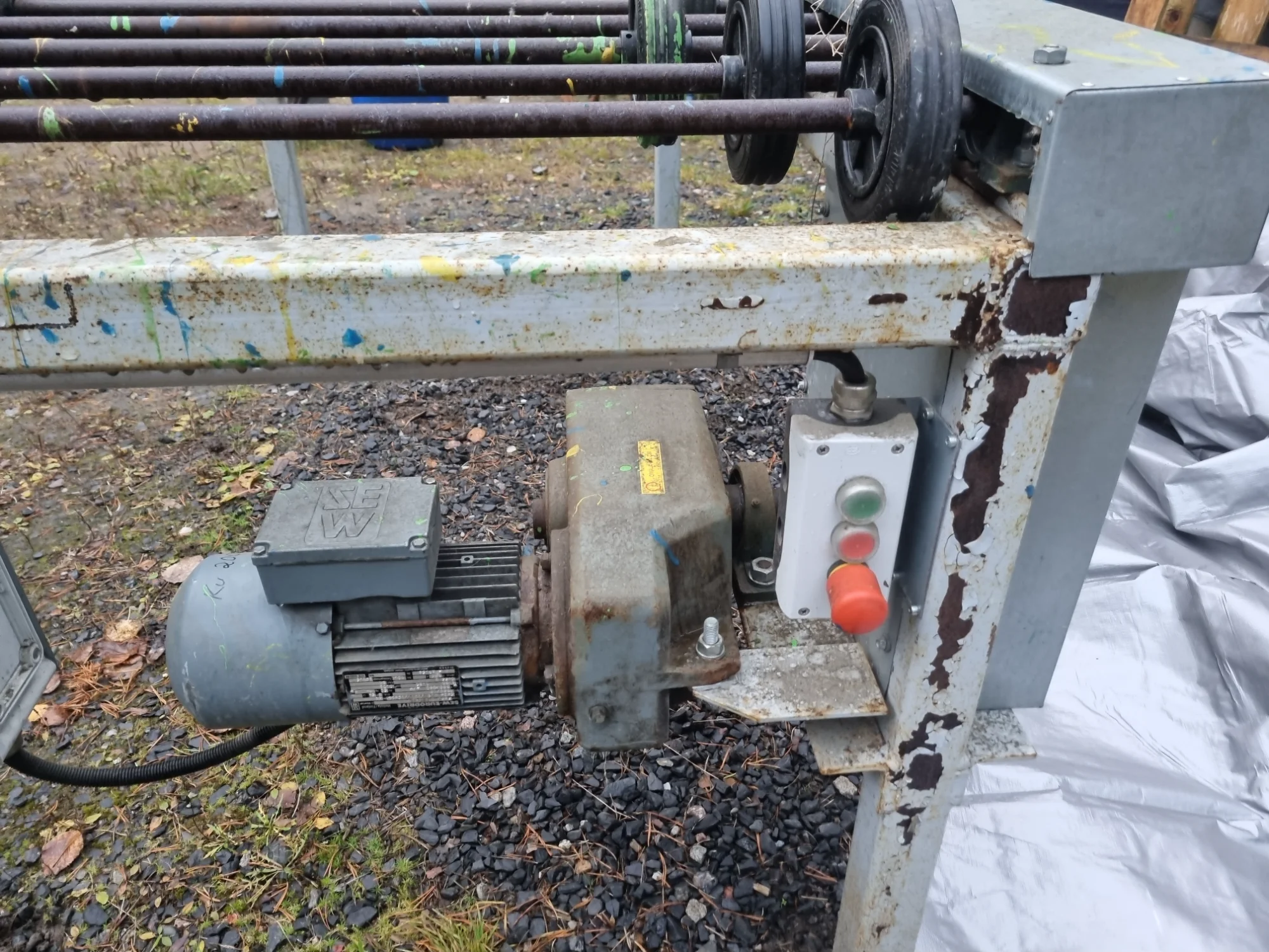 Tuli myös ostettua tällainen pöytä kun halavalla sai, pitää yrittää selvittää mikä tuo on... Runko neliöpalkkia, sähkömoottori välityksellä, pöydän joka kolmas rullasarja pyörii moottorilla, jne.